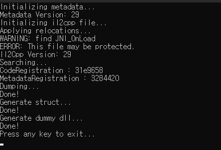 IL2CPPDumper 툴을 다운받아 실행해줍니다. 그러면 검은색 프롬프트 창이 뜰겁니다.