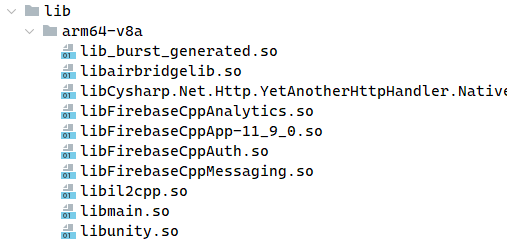 트리 구조를 살펴보면 위 사진처럼 .so 파일을 확인할 수 있습니다. 여기서 libil2cpp.so 파일이 바로 Unity에서 작성한 여러분의 C# 스크립트가 컴파일되어 나온 C++ 네이티브 코드입니다. 여기있는 .so 파일들을 모두 받아주세요.