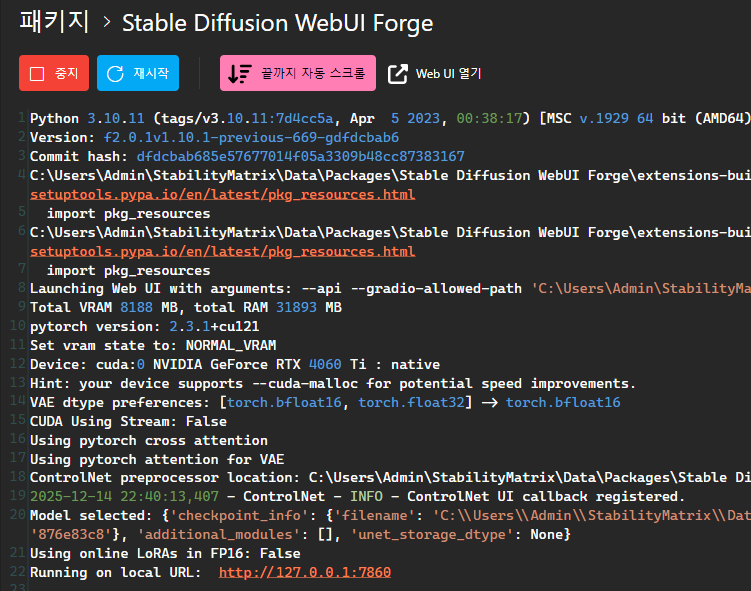 Stable Diffusion WebUI Forge 설치가 완료되었습니다.
