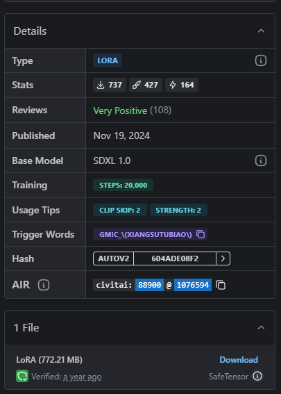 그리고 왼쪽 사진의 모델을 선택합니다. 그러면 오른쪽 사진처럼 LoRA 모델에 대한 정보를 확인할 수 있습니다. 하단에 Download 버튼을 눌러 다운로드 해줍니다.