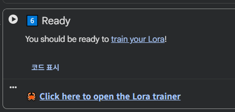 데이터 셋 작업이 무사히 끝났다면 Click here to open the Lora trainer 버튼이 등장합니다.