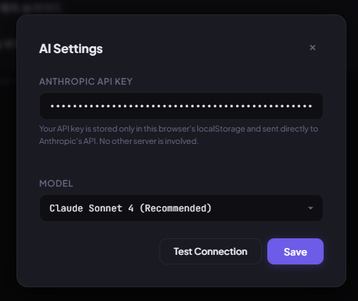 그랬더니 위 사진처럼 Claude API Key 설정과 사용할 LLM 모델 세팅 패널을 만들어줬습니다.
