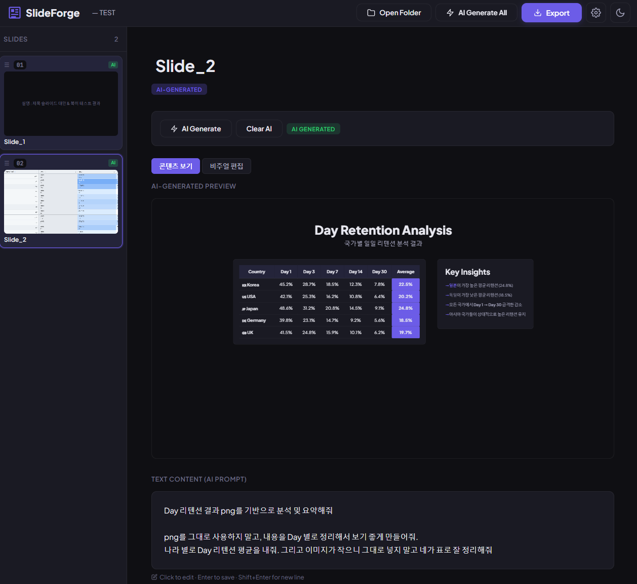 다음은 AI 기반 슬라이드 생성 기능으로 넘어가겠습니다.