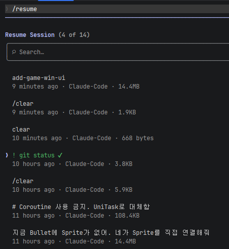 Claude Code를 종료했다가 다시 시작할 때, 이전 대화 맥락을 이어서 작업할 수 있습니다.