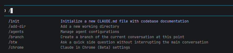 Claude Code는 / 접두사로 시작하는 슬래시 명령어를 지원합니다.